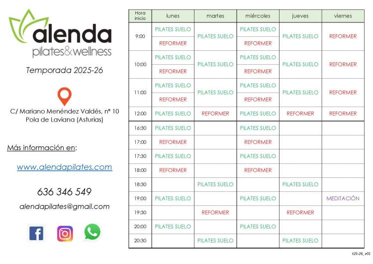 Horarios de pilates suelo (MAT) y máquina (Reformer) para nuestra 12ª temporada, 2025-26 (meses de septiembre 2025 a junio 2026, ambos incluidos):